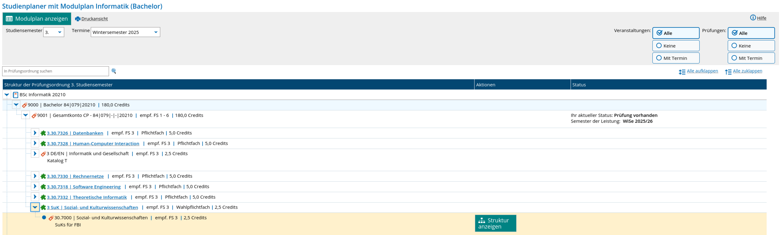 - Darunter sehen Sie die Struktur Ihrer Prüfungsordnung mit allen Modulen und Veranstaltungen.